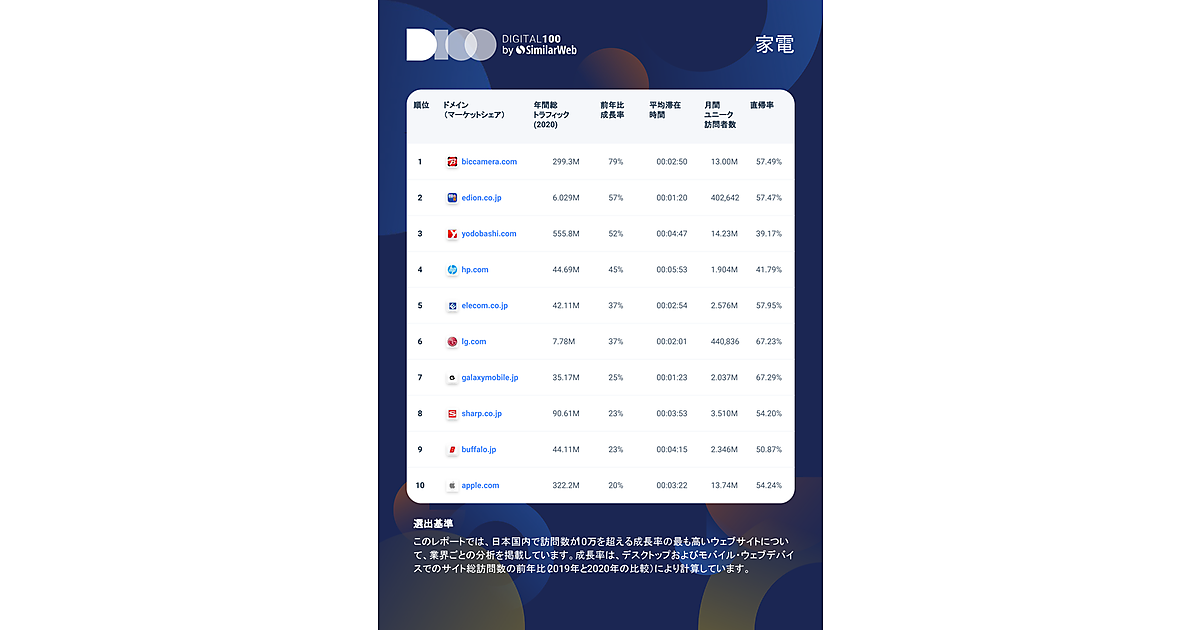 「Digital 100」は、国以内主要産業のサイト(年間訪問数10万以上)について、デスクトップならびにモバイルデバイスでのサイト総訪問数が、前年比(2019年対2020年)でもっとも大きいサイト100(10の業界カテゴリのトップ10)を、SimilarWebのデータに基づき選出している。
