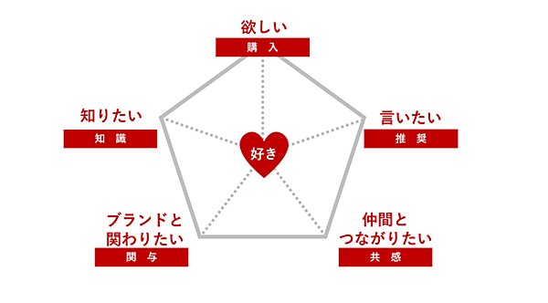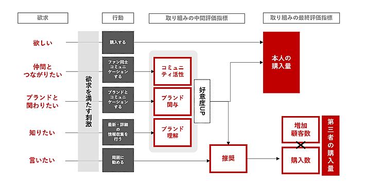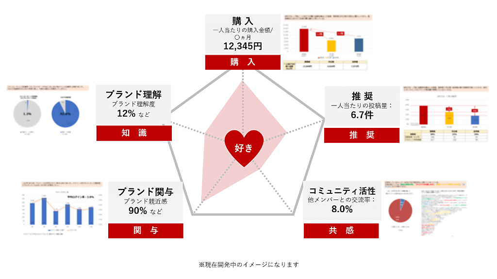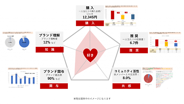 ファンの表現・行動の分析指標「アンバサダーマインド」と、ファンの行動とビジネス貢献の因果関係を明確にする「貢献相関フロー」で構成する。アンバサダーマインドは「購入」「推奨」「知識」「関与」「共感」の指標で分析。貢献相関フローは、行動や気持ちの変化によるビジネスへの寄与を分解する。同社の「アンバサダープログラム」導入企業には無償提供する。