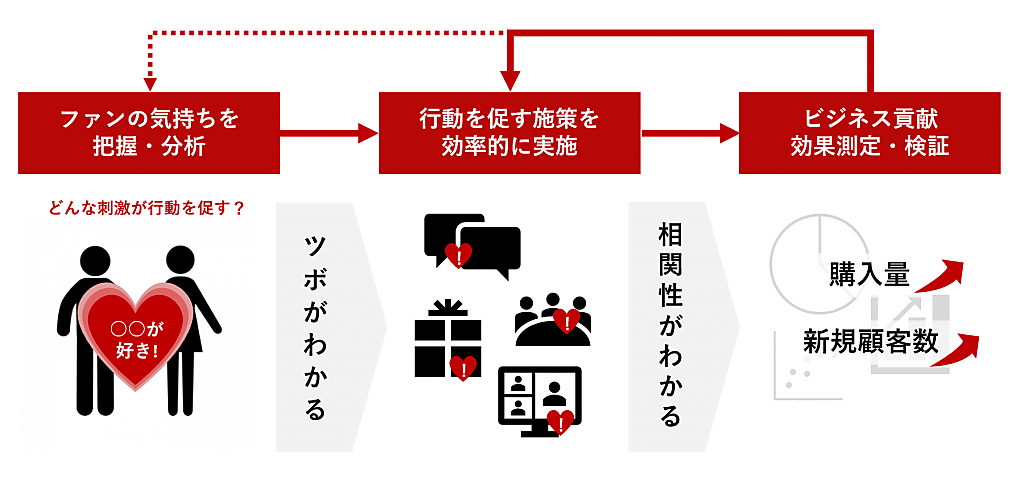 AMNはファンをマーケティングパートナーにする施策「アンバサダーマーケティング」を展開している。ファンの貢献を測定する指標は限られ、過小評価されていることが多いことから、アンバサダーアナリティクスを開発した。企業が保有する顧客情報や固有データと、AMNが提供するファン・アンバサダー登録・分析システムを通じて取得した情報を組み合わせる。