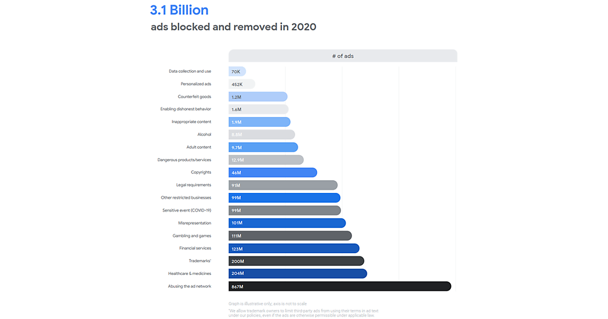 Google広告では2020年に、広告主の身元確認プログラムを導入したほか、広告主向け・パブリッシャー向けに40以上のポリシーを追加・更新した。その結果、ポリシー違反を理由に約31億件の広告をブロック・削除したという。