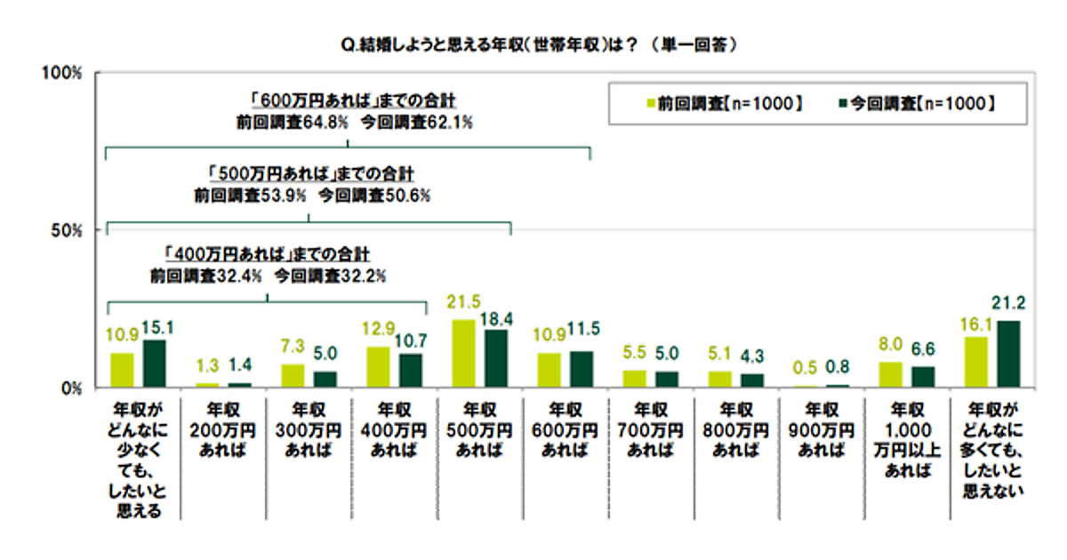 全回答者(1,000名)に、「結婚しようと思える世帯年収額」を聞くと、「年収400万円あれば」としたのは全体の32.2%、「年収500万円あれば」は50.6%、「年収600万円あれば」は62.1%だった。半数を超えるのは年収500万円がラインとなっているが、この数値は前回53.9%よりやや下降している。なお「年収がどんなに多くても、したいと思えない」との回答は、前回16.1%から21.2%と大幅に上昇した。コロナ禍などもあり、全体的に結婚に消極的な人が増えているようだ。