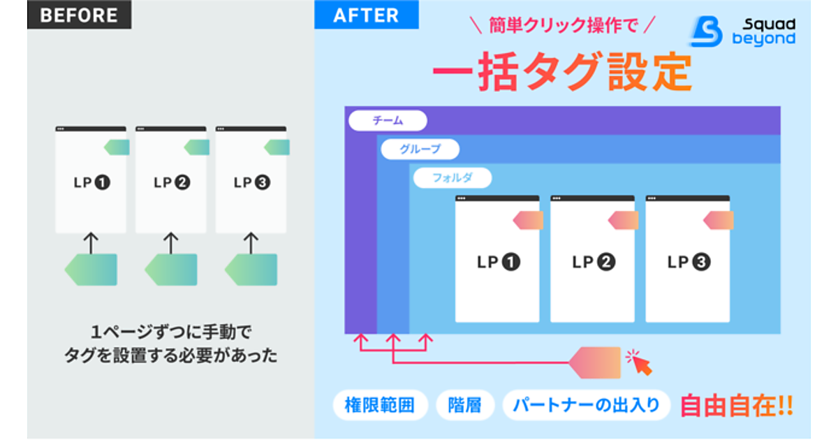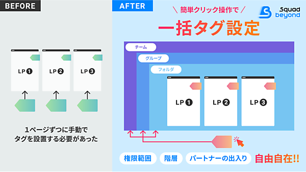 デジタルマーケティングプラットフォーム事業のSIVAは、同プラットフォーム「Squad beyond(スクワッドビヨンド)」に「タグ一括管理機能」を搭載した、と3月22日発表した。トラッキングや装飾などに使用するタグの管理が簡単になり、効率が高められる。初期設定すると、運用で発生するタグの追加・削除などの設定作業が不要になり、設定変更も管理画面で迅速にできる。