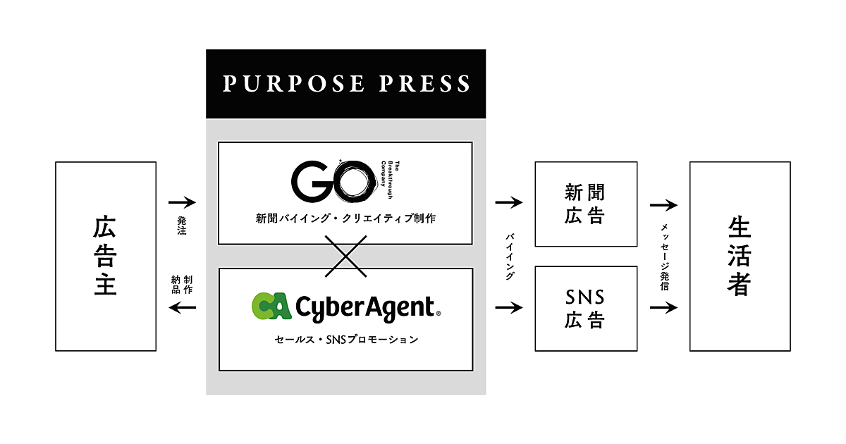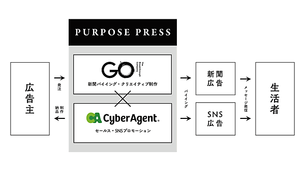 サイバーエージェントがセールスと、Twitter広告が中心のSNSのマーケティングプロモーションを担当し、GOが新聞のメディアバイイングと、企業のメッセージを届けるための新聞ならではの広告クリエイティブ制作を行う。GOはこれまでも、社会課題解決型の新聞広告を発信するサービス「ブランドニュース」を提供している。GOは電通、博報堂から独立した2人が2017年に立ち上げた。