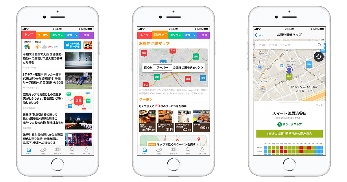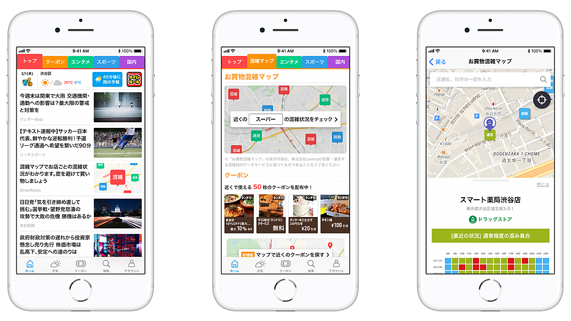 ニュースアプリ運営のスマートニュースは、同社が展開する同アプリ「SmartNews」で「お買い物混雑マップ」の表示を3月24日に始めた、と同日発表した。店舗ごとの時間帯別の混雑傾向をマップで紹介する。新型コロナウイルスの感染が再拡大する中、買い物に役立つ情報として提供し「密」を避ける“時差買い物”を支援する。