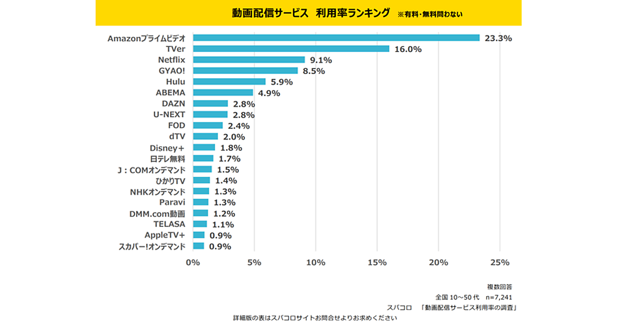 調査対象となったサービスは、Amazonプライムビデオ(アマプラ)、Hulu、TVer、Netflix、U-NEXT、dTV、DAZN、Paravi、ABEMA、Disney+、FOD、ひかりTV、NHKオンデマンド、スカパー!オンデマンド、TELASA、TSUTAYA TV、DMM.com動画、GYAO!、RakutenTV、J:COMオンデマンド、AppleTV+、日テレ無料、テレ朝動画、テレ東動画、TBS FREE(順不同)。