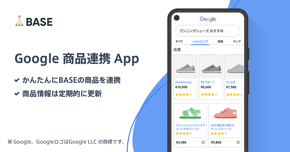 BASE加盟店の商品情報は、Google Merchant Centerを通じて1日に一度、自動更新される。Google商品連携Appで一度連携した後に販売を開始した商品情報でも、新たな手間をかける必要はなく自動で反映される。加盟店はGoogleショッピング広告とGoogleショッピングタブの無料リスティングによって、商品の認知拡大と販売促進ができる。