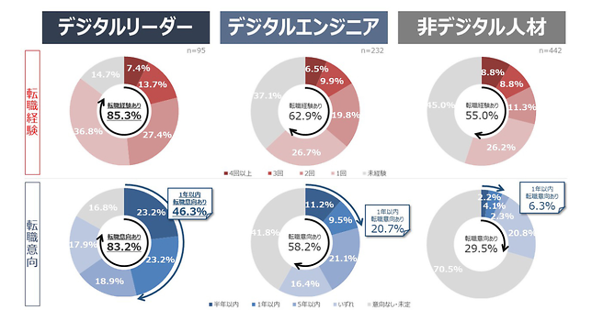 続いて769人を対象に「転職」について聞くと、85.3%のデジタルリーダーが転職を経験しており、デジタルエンジニアの62.9%、非デジタル人材の55.0%を大きく上回っている。また今後の転職意向についてもデジタルリーダーは、全体の83.2%が「転職の意向がある」と高い。期間を1年以内に限っても46.3%が「転職の意向がある」と回答している。これはデジタルエンジニアの20.7%の倍以上を示している。
