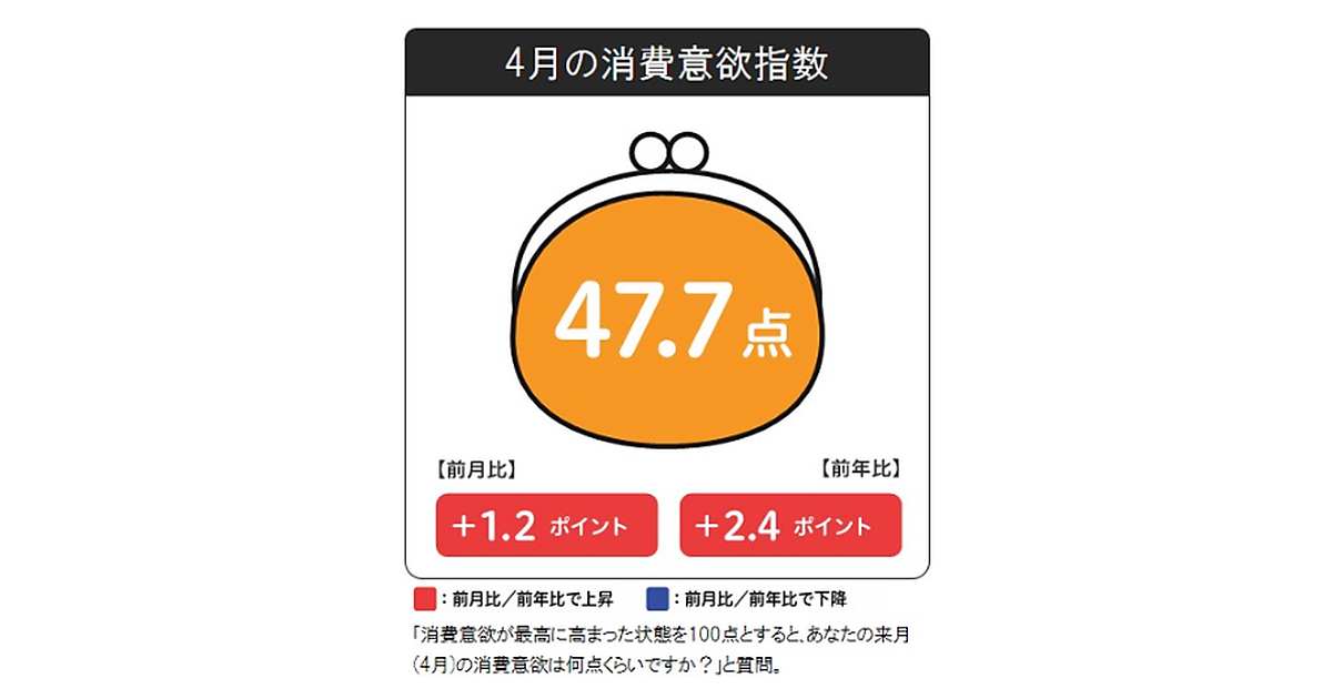 その結果、4月の消費意欲指数は「47.7点」。3月から1.2ポイント、前年4月から2.4ポイントと大きく増加した。この数字は過去5年では、4月として最高値だという。