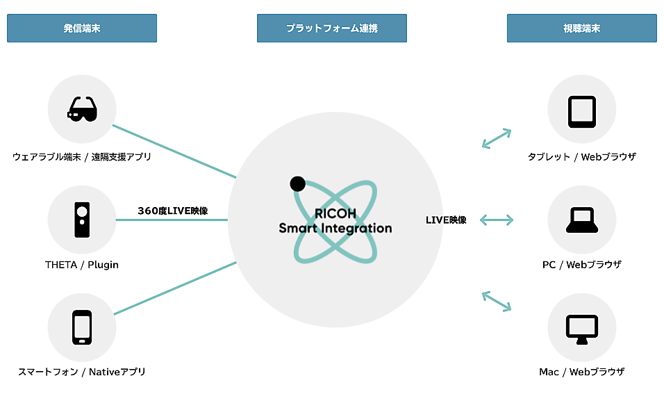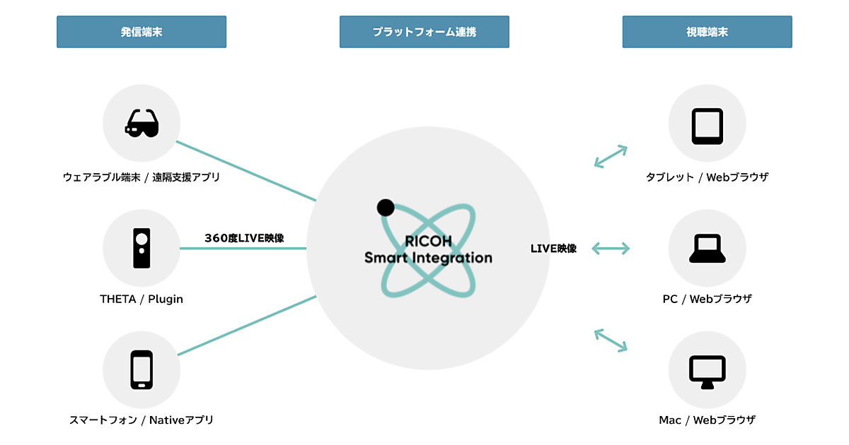 現行の4Gなどのモバイルネットワーク環境でも安定した接続が可能。4K画質(解像度3840×1920)まで対応し、リコーの360度撮影カメラ「RICOH THETA」と組み合わせることで、臨場感のあるライブストリーミングも実現。普及が見込まれる次世代モバイル通信システムの5Gを活用すると、さまざまな現場や用途への展開が期待できる。