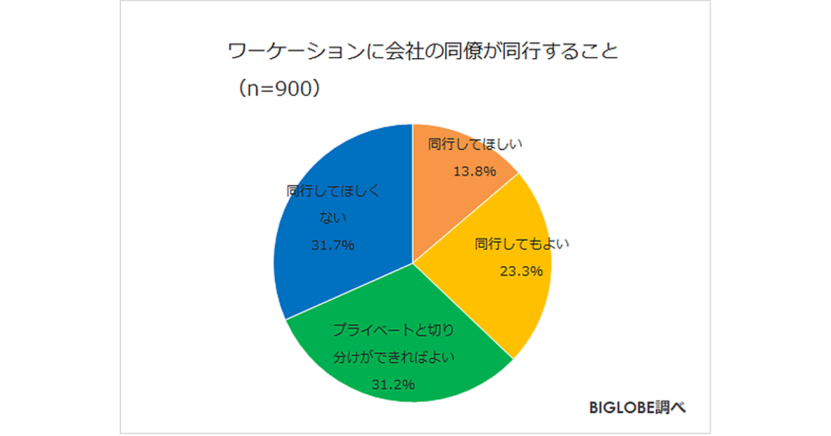 一方、従業員側の900人に、「ワーケーションをするとして、会社の同僚が同行してもよいか」と聞くと、「同行してほしい」13.8%、「同行してもよい」23.3%、「プライベートと切り分けができればよい」31.2%、「同行してほしくない」31.7%で、計7割近くが、ワーケーションに同僚が同行することを受け入れる姿勢を見せた。