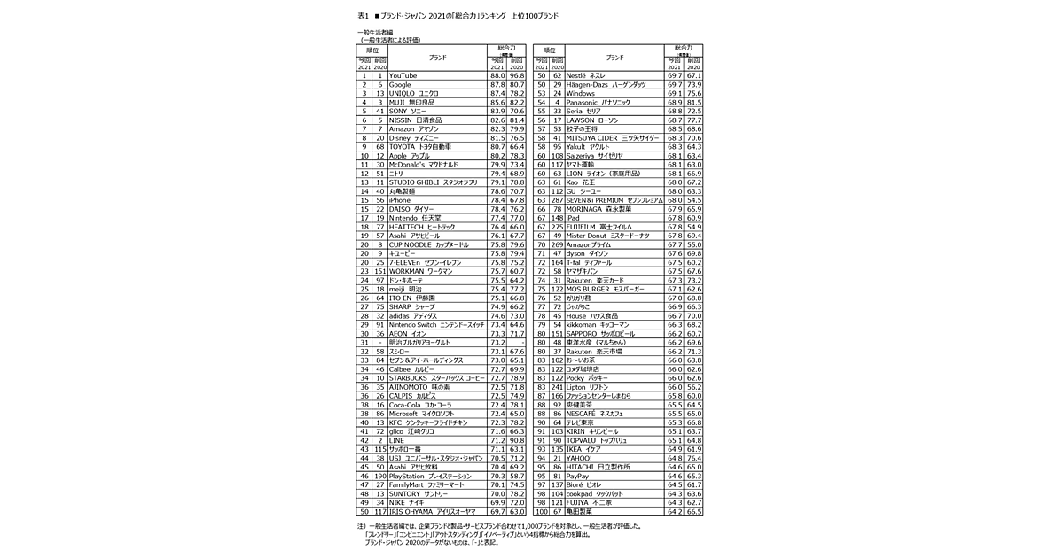 2位以下には、「Google」(前回6位)、「ユニクロ」(前回13位)、「無印良品」(前回3位)、「ソニー」(前回41位)が続く。トップ10圏内では、ユニクロ、ソニーの他、ディズニー(前回20位)、トヨタ自動車(前回68位)、アップル(前回12位)が返り咲いている。