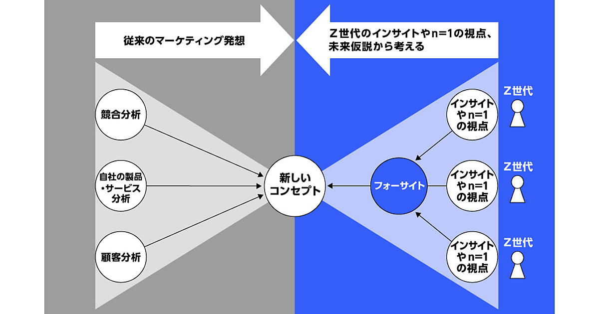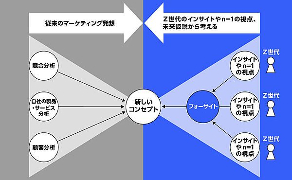 電通は、同社のプランニング・クリエイティブユニット「電通若者研究部(電通ワカモン)」が、企業活動のコンセプト開発を支援するプランニングメソッド「Foresight Plannin(フォーサイトプランニング)」の提供を始める、と4月6日発表した。「Z世代(1990年代半ば~2000年代初めに生まれた若年層)」のインサイト(深層心理)から導き出す未来仮説(フォーサイト)を起点にする。