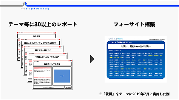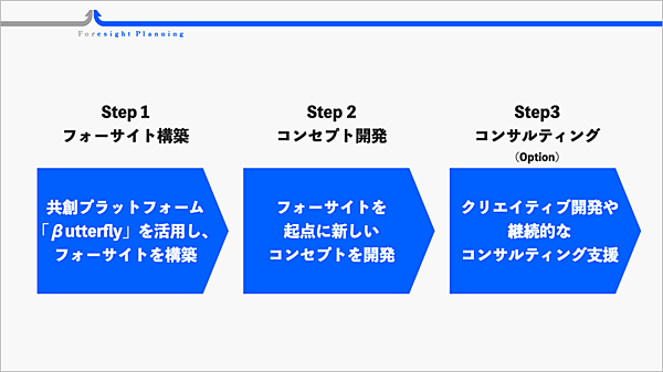従来型マーケティング発想の競合分析・顧客分析だけでなく、Z世代のインサイトやn=1(1人の顧客を深く掘り下げる分析手法)の視点に立脚したフォーサイトに基づくことが特長。(1)βutterflyを活用したフォーサイトの構築(2)フォーサイトを起点にしたコンセプト開発(3)クリエーティブ開発や継続的なコンサルティング活動の提供(オプション)--の3段階でプランニングする。