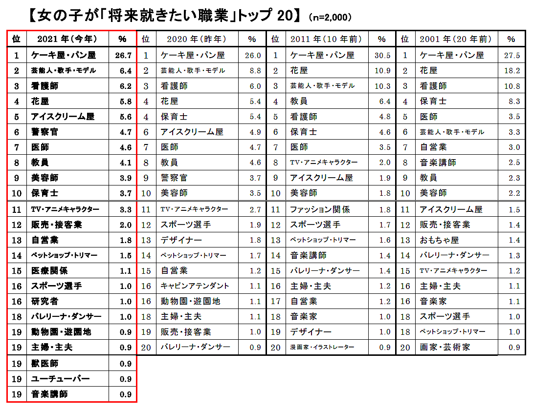 一方女の子の「将来就きたい職業」は、23年連続で「ケーキ屋・パン屋」26.7%が圧倒的1位。2位「芸能人・歌手・モデル」6.4%、3位「看護師」6.2%も前年と同じ順だった。