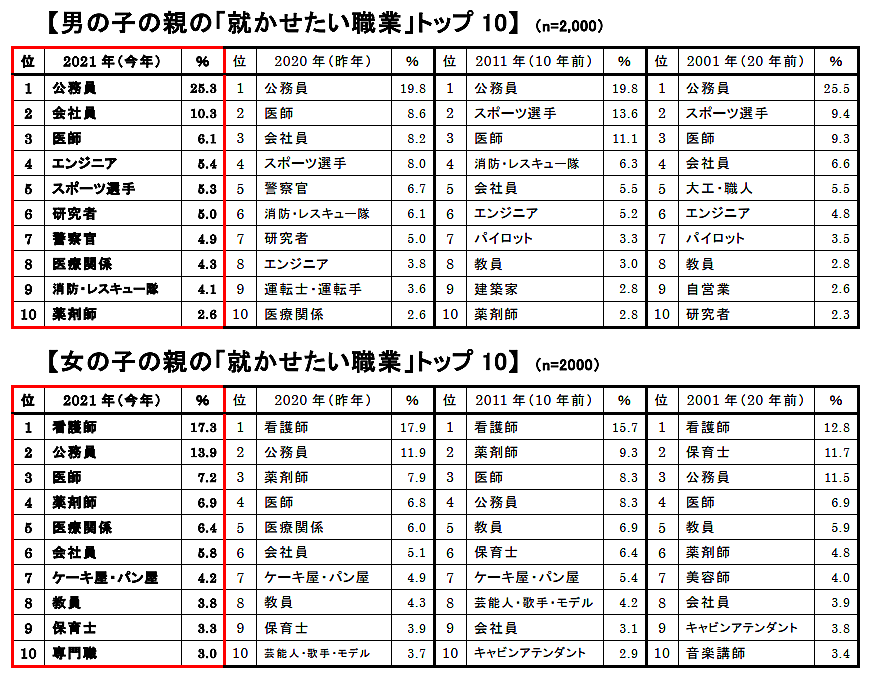 そして親の側に「子どもに就かせたい職業」を聞くと、前年同様、男の子に就かせたい職業1位は「公務員」25.3%、女の子に就かせたい職業1位は「看護師」17.3%だった。男の子は「公務員」が前年より大きく上昇したほか、2位「会社員」10.3%が過去最高を更新するなど、安定志向が強くなっている。一方女の子は、トップ5のうち4つを医療職が占めており、資格志向が強いと推測される。なお女の子2位「公務員」も過去最高を更新している。