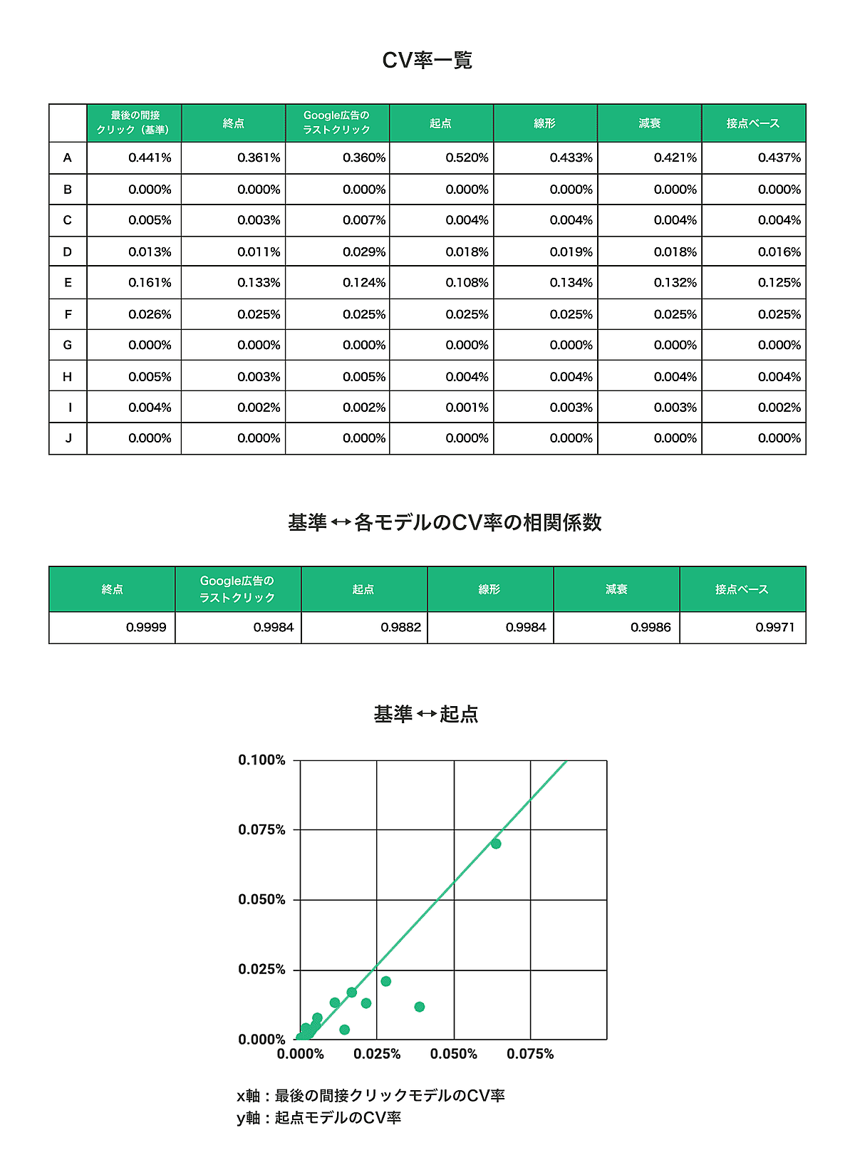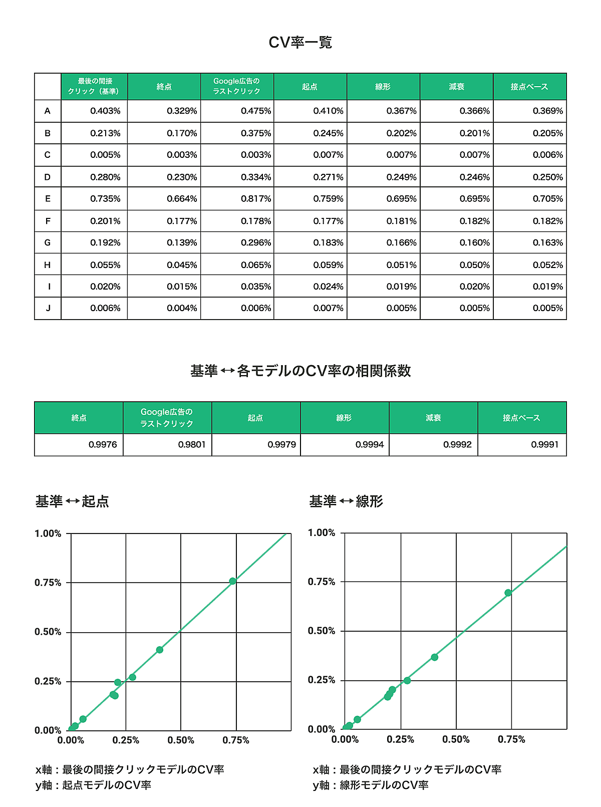 「有料検索」においては、相関係数は0.98以上とほぼ1に近く、基準と各モデルには強い正の相関があると言える。CV率をプロットした散布図においてもデータが一直線上にきれいに並んでいる。