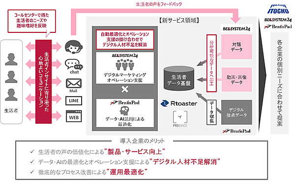 新サービスは、ベルシステム24のコンタクトセンター現場での応対実績やBPO(業務プロセスの外部委託)事業の運用ノウハウと、ブレインパッドが持つデータ分析、デジタルマーケティング基盤を組み合わせ、さまざまなDXの実現をサポート。伊藤忠商事の各カンパニー、グループ各社、パートナー企業や、ベルシステム24とブレインパッドの多様な業種のクライアント企業に向けて提案する。