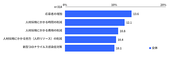 最も成果があった内容を尋ねたところ、「応募者の増加」が13.6%で最多となった。次いで「人材採用にかかる時間の削減」12.1%、「人材採用にかかる費用の削減」10.8%、「人材採用にかかる労力(人的リソース)の削減」10.4%とリソースの削減についての回答が続いた。