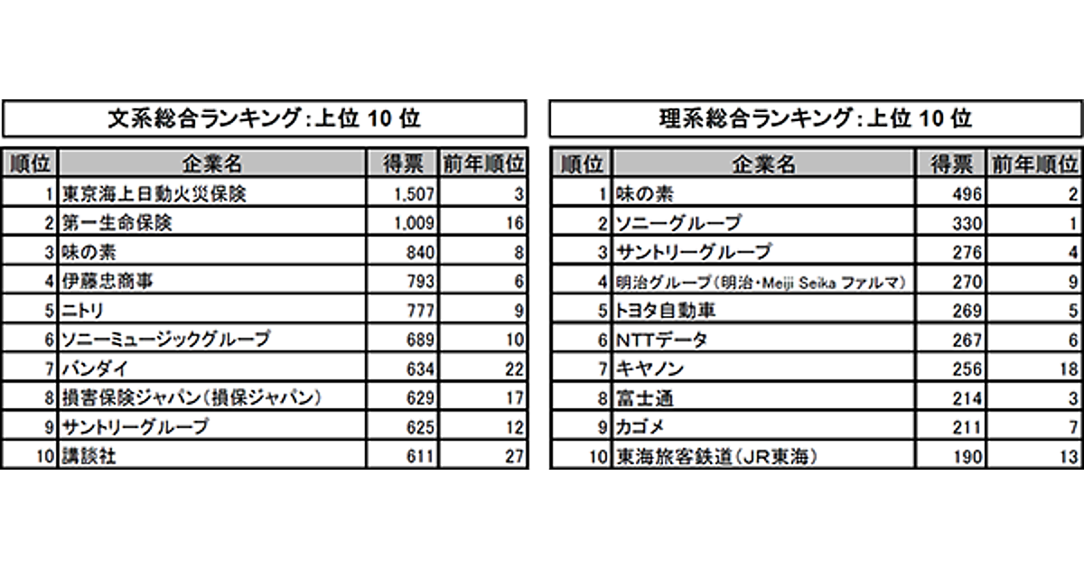 文系では東京海上日動火災保険が1982年(1983年卒)以来の1位となった。2位には前年16位の第一生命保険、3位には前年8位の味の素が続いた。コロナの打撃を受けた旅行・航空業界の企業が軒並みランクを下げた一方で、巣ごもり需要の恩恵を受けた業界(食品・出版・音楽・ゲーム・スーパー)の上昇が目立った。