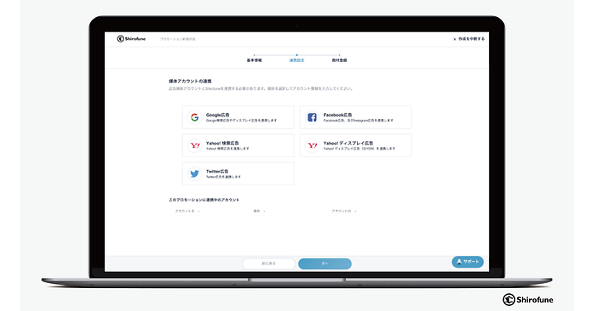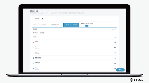 入札単価調整など経験者が手動で行っていた業務もアルゴリズム(計算手法)が自動で再現するので、Twitter広告の運用経験に関わらず高い成果を出せる。対応済みの「Google広告」「Yahoo!広告」「Facebook広告(Instagram広告)」とともに、Shirofuneの同一仕様の管理画面で主要4媒体を横断した成果分析や入札最適化が一括管理できる。