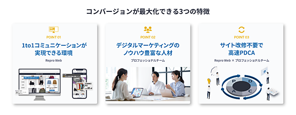 Web接客ツール「Repro Web」でサイト訪問者の行動・属性に合わせてパーソナライズした施策を実施。課題調査から施策立案と実行をReproのプロフェッショナルチームが一貫して担う。デジタルマーケティングのノウハウや運用体制が不十分な企業でも売上拡大に向けた施策が可能になる。サイトの改修も不要でエンジニアのリソースを使用しない。