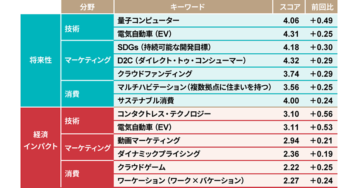 前回(2020年夏調査)との比較によると、「将来性」スコアが最も伸びたキーワードは、技術分野「量子コンピュータ」0.49ポイント増、マーケティング分野「SDGs(持続可能な開発目標)」0.30ポイント増、消費分野「マルチハビテーション(複数拠点に住まいを持つ)」0.25ポイント増だった。