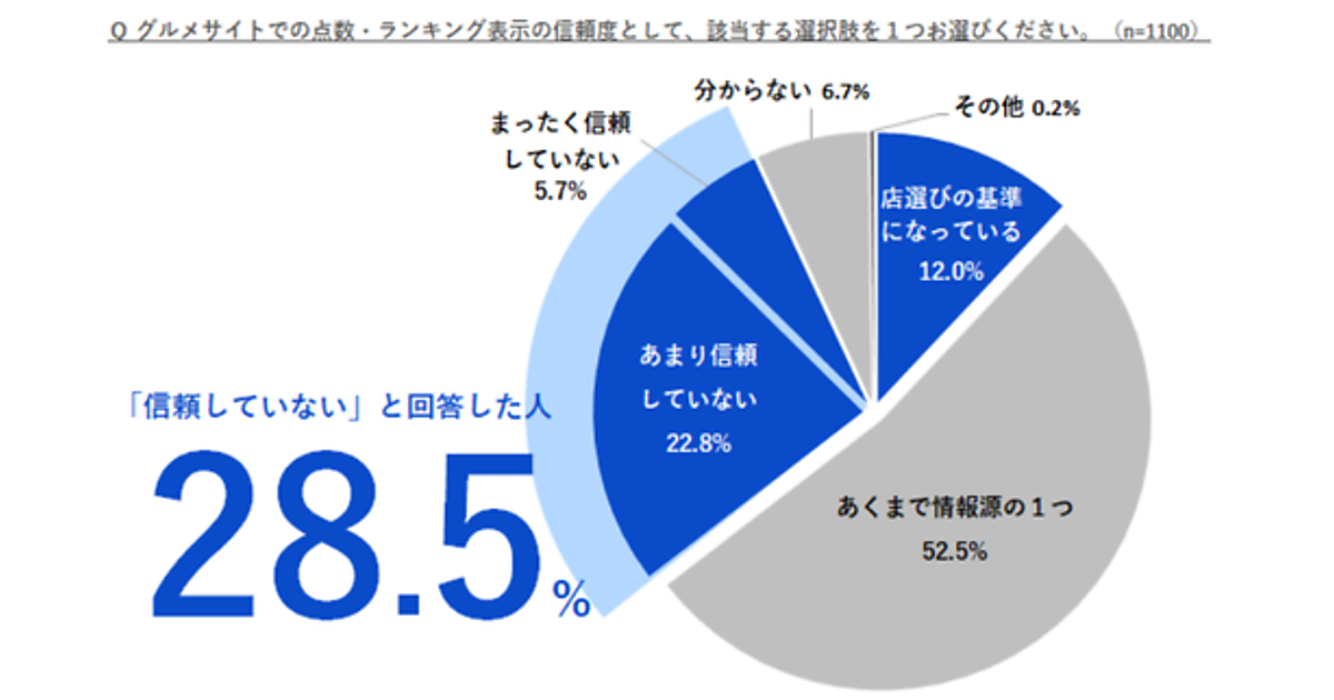 まず「グルメサイトにおける情報の信用度」を聞くと、「あまり信頼していない」22.8%、「まったく信頼していない」5.7%で、計28.5%が信用していなかった。「あくまで情報源の1つ」52.5%が主流で、信頼できる情報源としては正直機能していないのが実状だ。「あまり信頼していない+まったく信頼していない」の合計も前回より2.4ポイント増加するなど、悪化もしている。