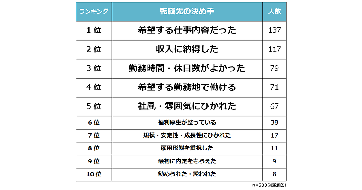 ビズヒッツが運営するメディア「Biz Hits」は、「転職先の決め手」に関する調査結果を発表した。転職経験者500人にアンケートを実施している。