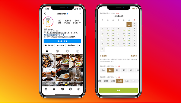 レストラン予約機能は、飲食店がInstagramの「ビジネスプロフィール」に「席を予約する」ボタンを表示し、ユーザーに来店予約を促すことができる仕組み。ビジネスプロフィールを利用しているアカウントが連携パートナーのウェブ予約サービスの加盟店だったら、無料で使用可能。