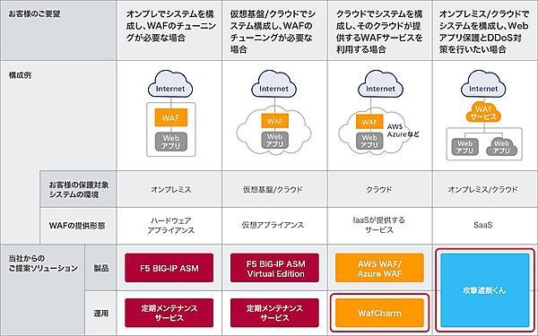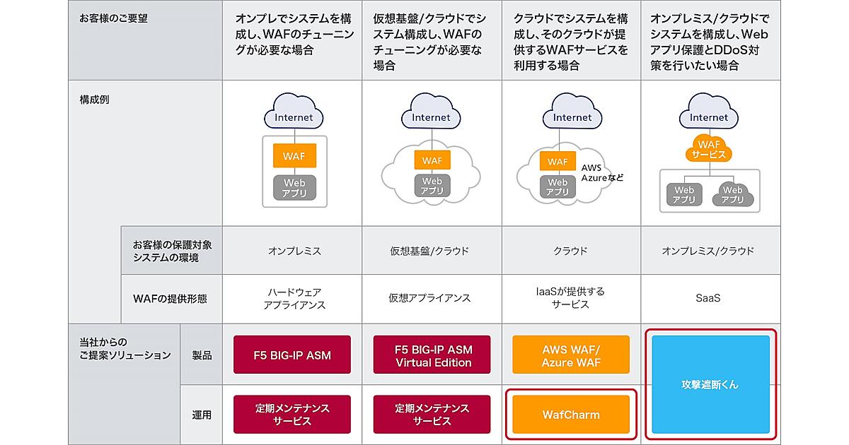 AI(人工知能)とビッグデータでWAFを自動運用する「WafCharm(ワフチャーム)」と、サイバー攻撃を可視化・遮断するクラウド型WAFの「攻撃遮断くん」の2つのWAF関連サービスが、新たにSCSKのソリューションに加わる。WafCharmはクラウド2大プラットフォームの「AWS」と「Microsoft Azure」に対応する。