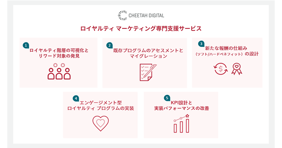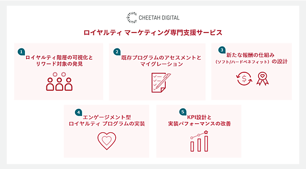 パーソナライズしたブランド体験のため、企業保有の既存顧客データと、新たに顧客から直接収集するゼロパーティデータを活用。顧客ランクごとの構成比から売上貢献度の高いリワード(報酬)対象者を見つけ、Cheetah LoyaltyのAI(人工知能)や機械学習機能で顧客一人ひとりに適切設計したエンゲージメント型ロイヤルティプログラムを実装する。KPI(重要業績評価指標)設計や月次・四半期のパフォーマンス改善プランも策定する。