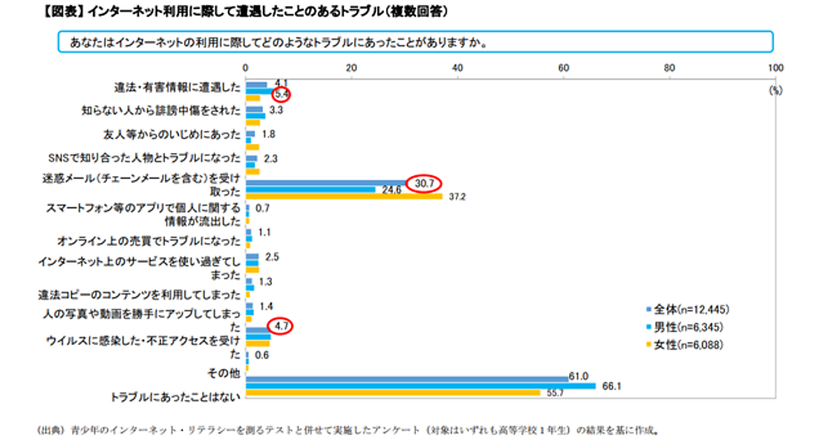 「遭遇したことがあるトラブル」については、「トラブルに遭ったことはない」が60.1%を占めるも、「迷惑メールを受け取った」30.7%、「ウイルスに感染した・不正アクセスを受けた」4.7%がそれに続いた。男女別では、男性ほど「違法・有害情報に遭遇した」、女性ほど「迷惑メールを受け取った」が多い。