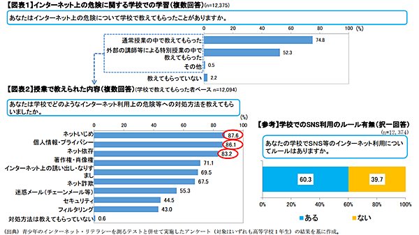 「インターネットリスクに関する学校での学習」については、74.8%が「通常授業」を、52.3%が「外部の講師等による特別授業」を受けており、内容では「ネットいじめ」87.6%、「個人情報・プライバシー」86.1%、「ネット依存」83.2%が上位だった。SNS利用についてルールを設けている学校は60.3%と半数を超えた。