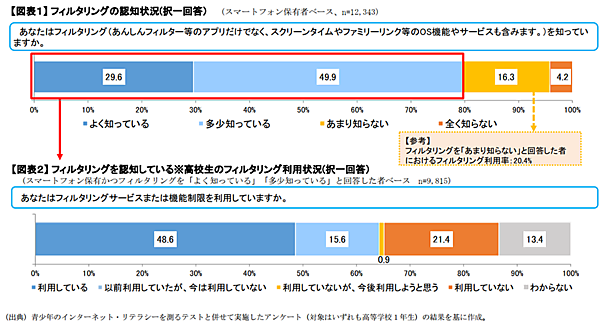 「フィルタリング」については、「よく知っている」29.6%、「多少知っている」49.9%で、計79.5%が認知していた(スマホを利用している高校生のみが回答)。この数値は2019年度(74.7%)から増加している。また、フィルタリングを認知している高校生のうち、48.6%が「フィルタリングを利用している」、15.6%が「以前利用していたが、今は利用していない」と回答している。