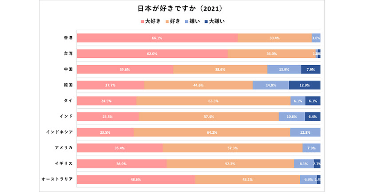 まず「日本が好きですか?」という設問に対し、「大好き」が最も多かったのは「香港」66.1%、最も少なかったのは「インドネシア」23.5%。「大好き+好き」の合計では最も多かったのは「台湾」98.0%、最も少なかったのは「韓国」72.3%だった。
