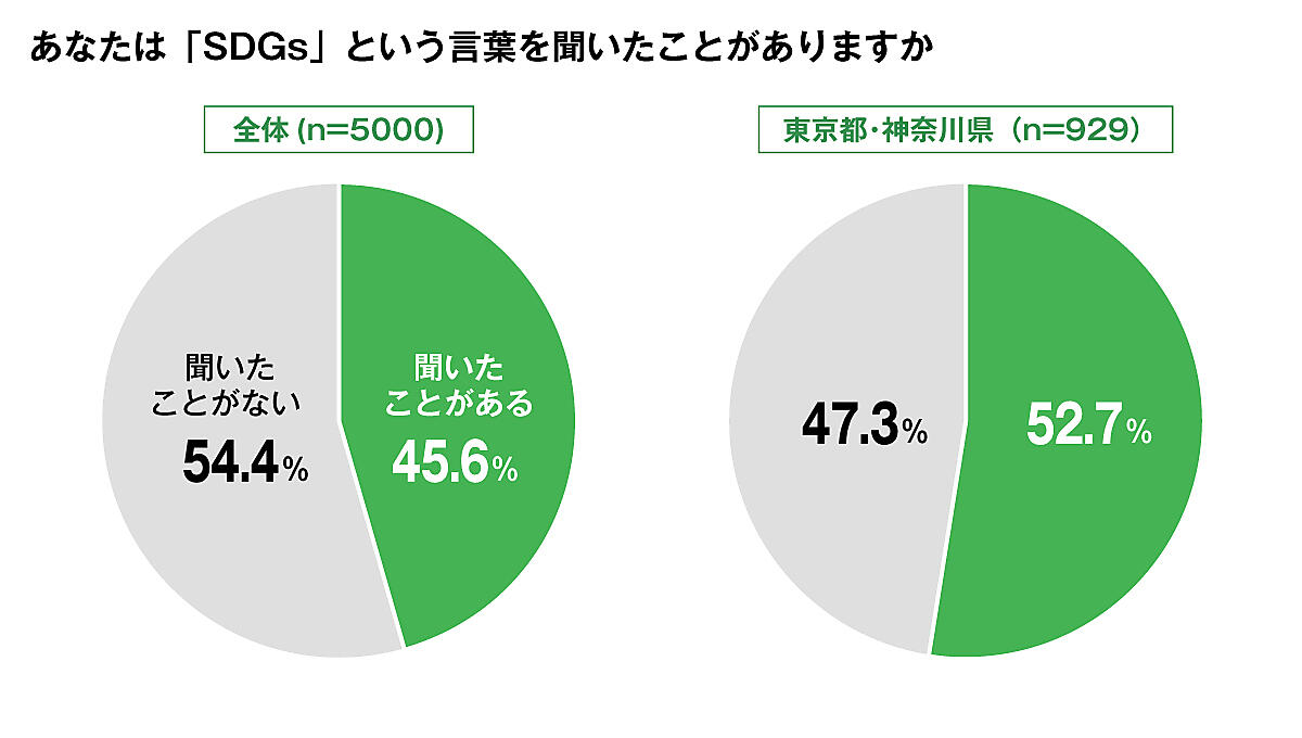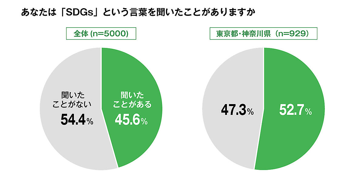 「SDGsという言葉を聞いたことがあるか」と質問したところ、全国では「ある」と答えた人が45.6%に上ったことがわかった。前回までの調査対象の東京都・神奈川県に絞ると、認知度は52.7%で、今回初めて50%を超え、ほぼ2人に1人が「聞いたことがある」という結果になった。