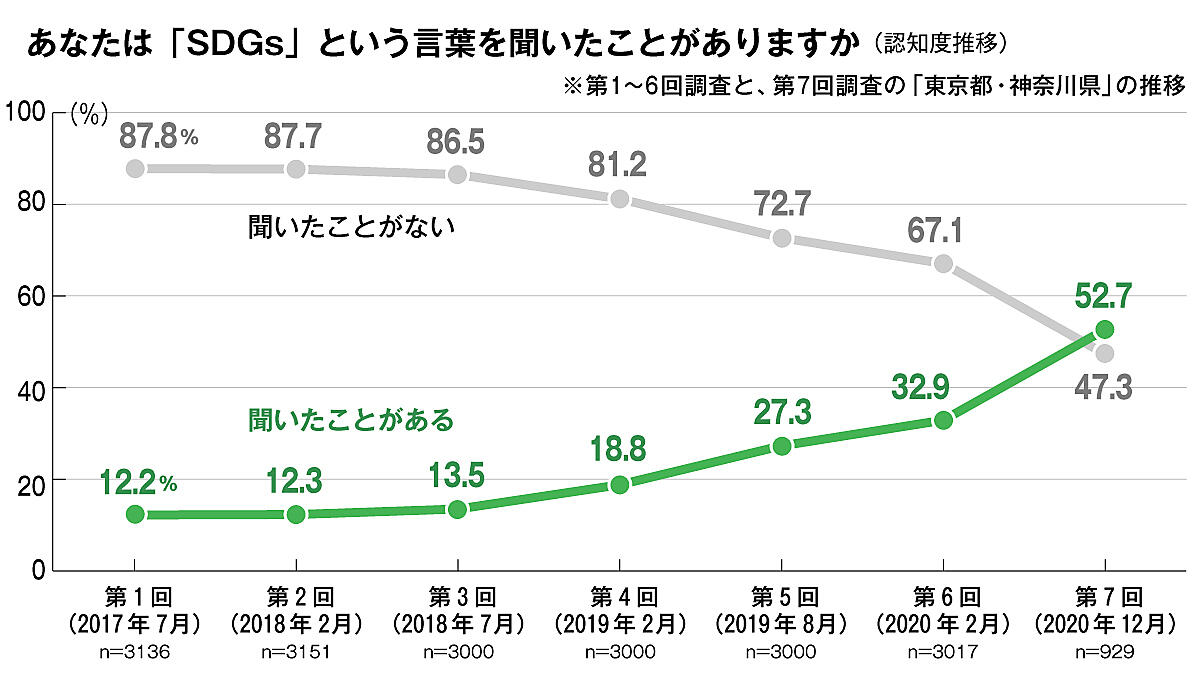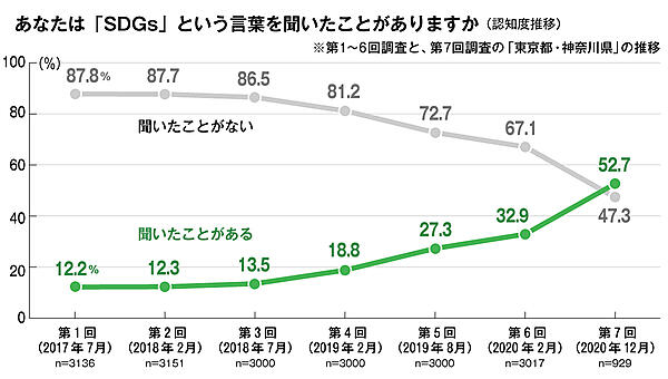 今回から調査設計を変えたため単純な比較はできないが、第1~6回と第7回の東京都・神奈川県の推移を見てみると、「SDGsという言葉を聞いたことがあるか」という質問に「ある」とした人は、前回の32.9%から52.7%へ大幅に上昇。初めて「ない」を上回り、SDGsが浸透していることがうかがえる。