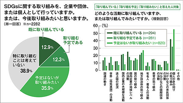 調査では、企業や個人でのSDGsに関する取り組み状況についても聞いた。「SDGsという言葉を聞いたことがある」とした2,282人に、「SDGsに関する取り組みを企業や団体、または個人として行っているか」、または「今後取り組みたいと思っているか」を聞いたところ、「既に取り組んでいる」と回答したのは12.9%のみであった。