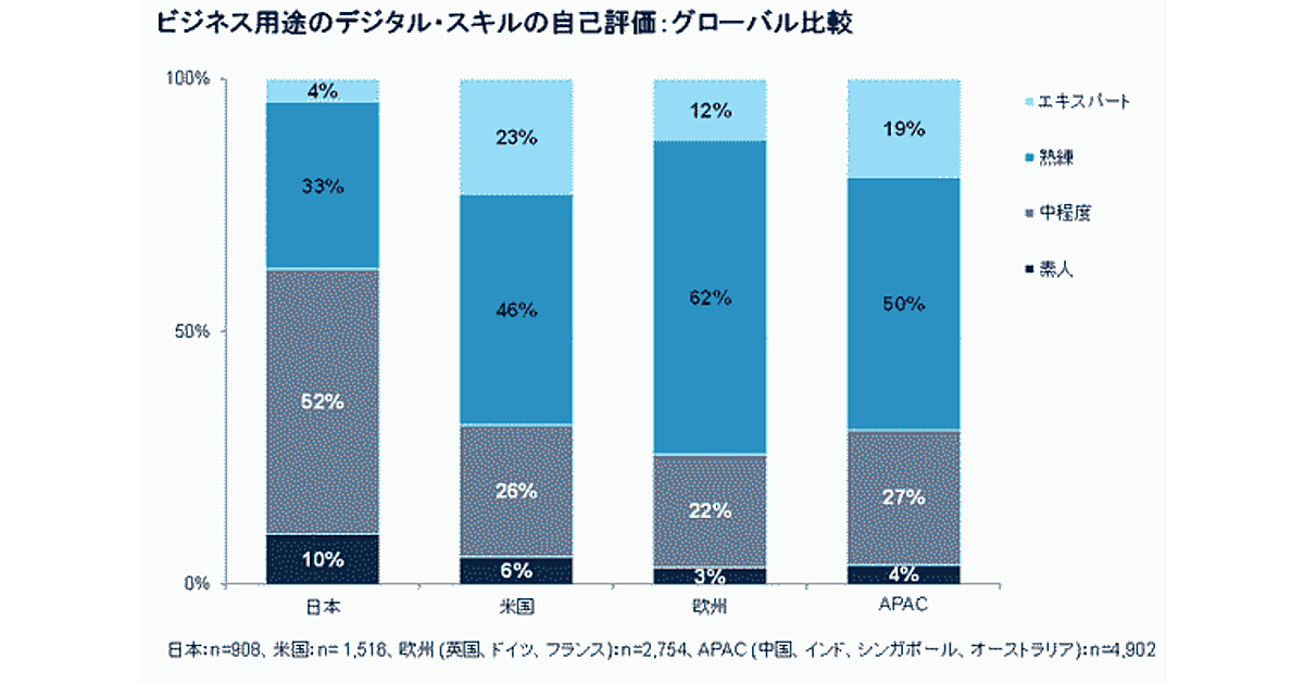 まず、ビジネス用途のデジタル・テクノロジのスキルについて、「自己評価(自身のスキル・レベルをどう捉えているか)」を聞くと、日本は「素人」10%、「中程度」52%、「熟練」33%、「エキスパート」4%だった。