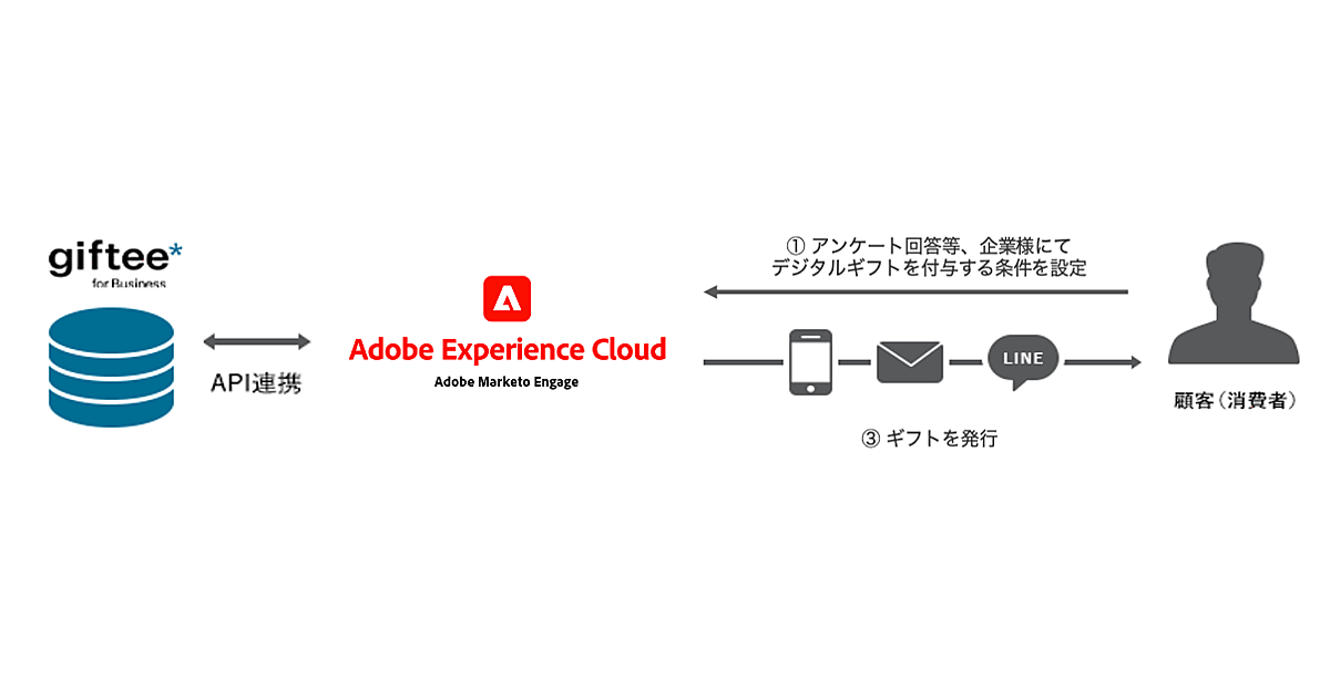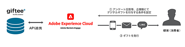 giftee for Businessはキャンペーンの景品やアンケートの謝礼、来店促進などでeギフトが配布できる法人向けソリューション。今回、Adobe Marketo Engageで行うウェブキャンペーンでeギフトが手軽に利用できるようにシステム連携した。Adobe Marketo Engageのユーザーは、eギフトを使うウェブマーケティング施策が送料をかけることなく迅速に可能になる。