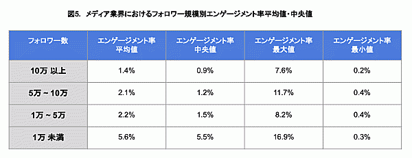 同様にアカウント規模別で、エンゲージメント率を見ると、こちらもフォロワー数が少ないほど、エンゲージメント率の高いアカウントが多かった。統一感のある投稿により、エンゲージメントを獲得しているようだ。
