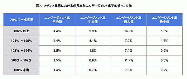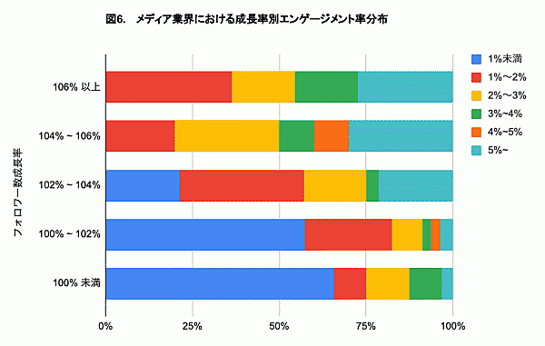 さらに、アカウントのフォロワー数成長率別に、エンゲージメント率を見ると、成長傾向にあるアカウントほど、エンゲージメント率が高まる傾向があったとのこと。