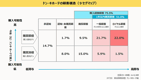 ドン・キホーテの利用頻度を見ると、月1以上購入している「ロイヤル顧客」は23.5%、月1未満年1以上購入している「一般顧客」は27.6%だった。一方、今後の利用意向で見ると、積極層(1年以内利用顧客)は4割を超えている。