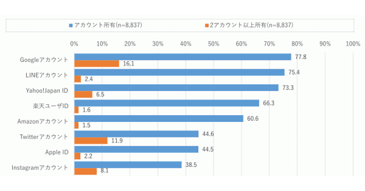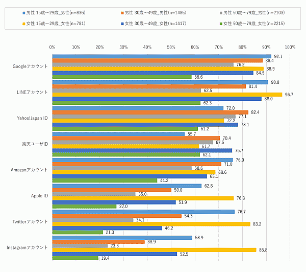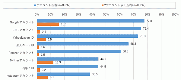 「Google」「LINE」「Yahoo! Japan」「楽天」「Amazon」は過半数がアカウント所有