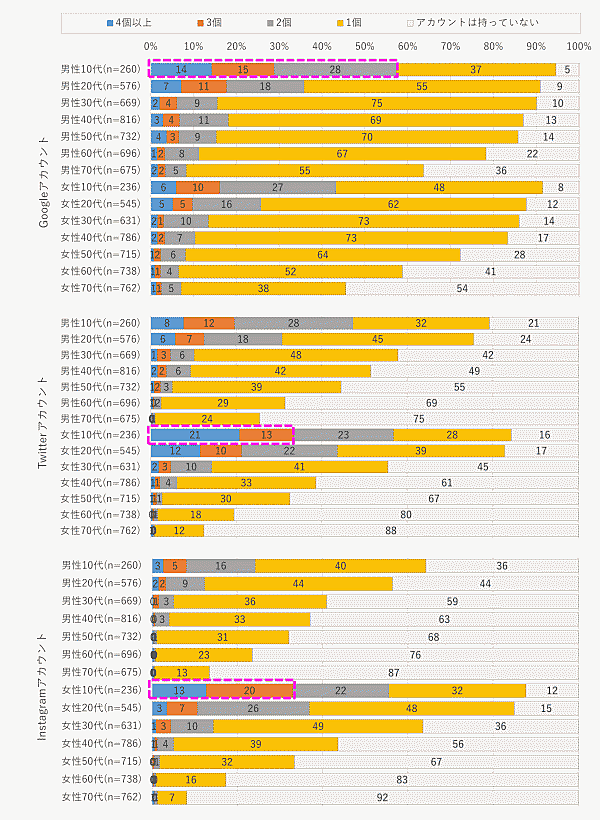 10代男性は過半数が「Googleアカウント」を複数所有、10代女性は3人に1人が「Twitterアカウント」「Instagramアカウント」を3アカウント以上持っていた。