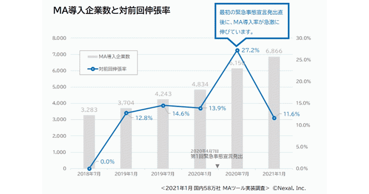 Nexalは、国内企業のマーケティングオートメーション(MA)ツールの導入率について調査した結果を発表した。国内58万社のWebサイトに対して独自プログラムを用いたクローリングを行い、対象タグが実装されているかを直接調査した(調査時期:2021年1月)。