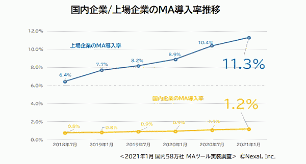 2018年7月からの導入率変化を半年単位で見ると、国内企業全体でのMAツール導入率は0.1ポイント程度の増加だが、上場企業については、半年前(2020年7月)の10.4%から11.3%と、ほぼ1ポイントの上昇を示しており、上場企業での導入が加速していることがわかる。