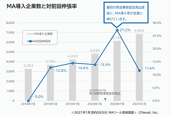 また2020年1月→2020年7月は、MA導入企業数が対前回伸長率27.2%の大幅上昇を見せており、新型コロナでDXがさらに着目され、サイトのMA導入を推し進めた可能性が高い。