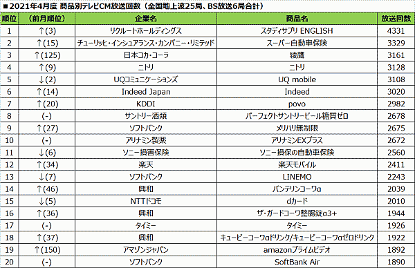 それによると、最もCM放送回数が多かった商品は、リクルートホールディングス「スタディサプリENGLISH」4,331回だった。同商品は3月度の放送回数のほうが4,396回と多かったが、順位は3位だった。
