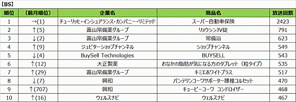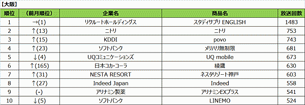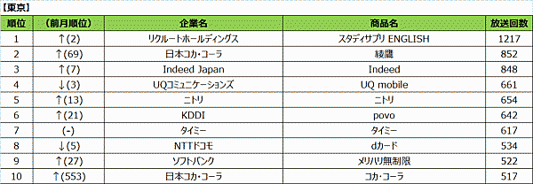 以下2位にチューリッヒ・インシュアランス「スーパー自動車保険」3,329回(前回15位)、3位に日本コカ・コーラ「綾鷹」3,161回(前回125回)と続くなど、上位は大きく順位が入れ替わっている。年度末・年度初めでCM放送回数が大きく変動したことが理由として考えられる。